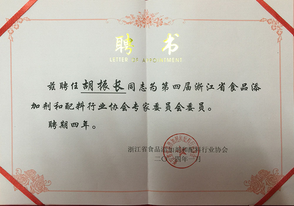 - Member of Zhejiang Province Food Additive & Ingredients Industry Expert Committee