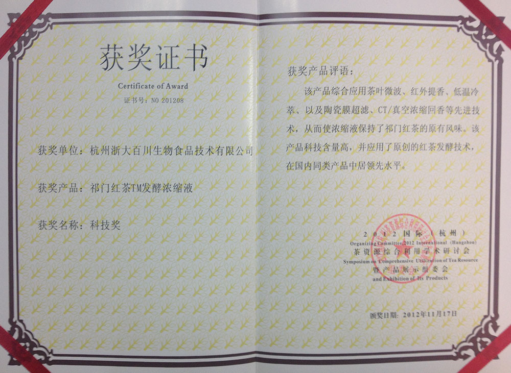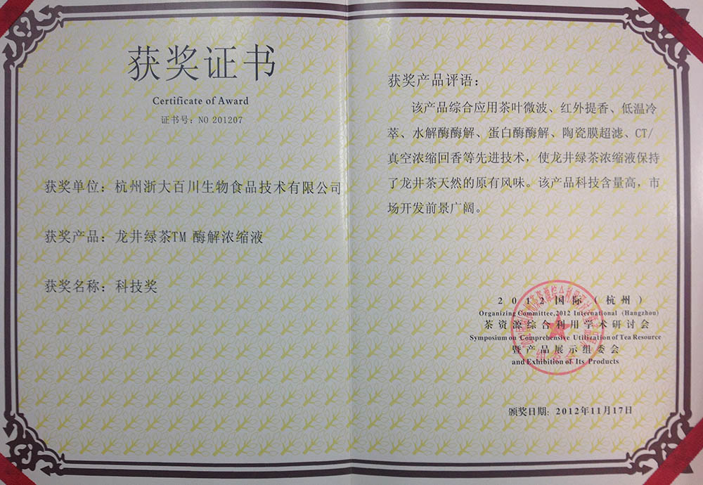 - Technology Award of Longjing Green Tea Enzymolysis Concentrate